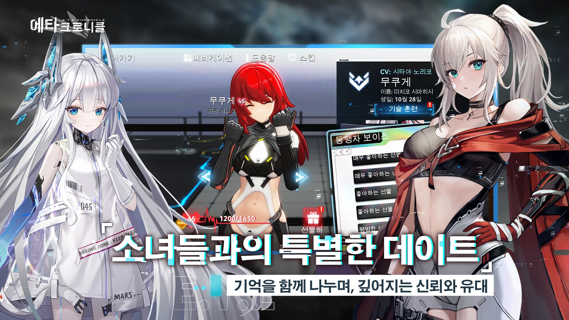 ‘에타 크로니클’의 또 다른 매력은 메카와 미소녀의 조합입니다. 실제 무기와 장비를 기반으로 재해석된 기체 디자인은 정밀한 3D 모델링으로 구현되어 사실감을 높였고, 탑승하는 소녀 캐릭터들 또한 개성 넘치는 비주얼과 성격을 지니고 있습니다. 유명 성우진이 참여해 캐릭터의 감정선을 생생히 살려내며, 호감도와 서약 시스템을 통해 캐릭터와의 교감을 즐길 수도 있습니다.