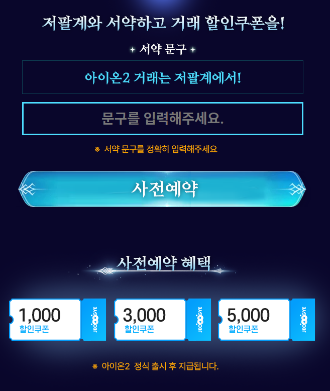 - 참여 방법: 아주 간단합니다! 이벤트 페이지에서 "아이온2 거래는 저팔계에서!" 문구를 입력하고 제출하기만 하면 끝!